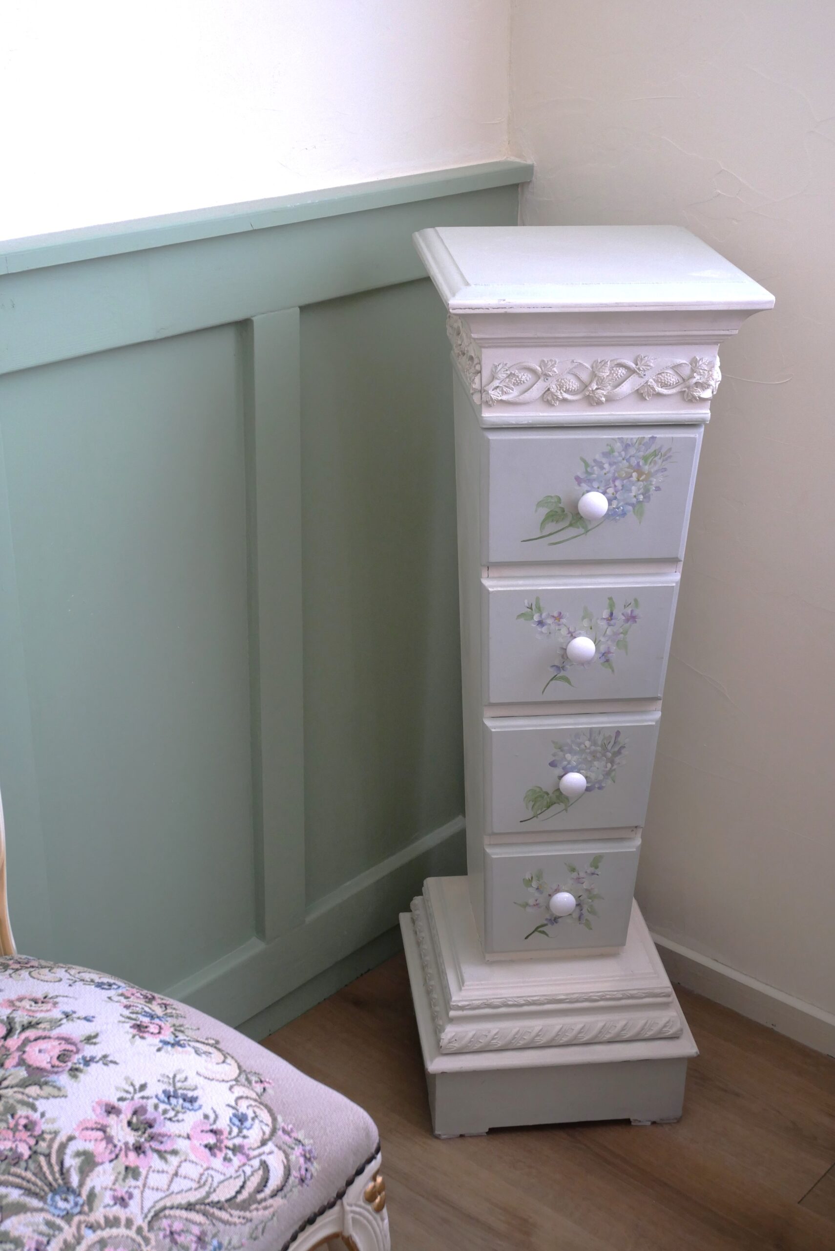 白と薄緑色のツートンカラーで、4杯の引き出しには、一つ一つ表情の違うお花が手書きで書かれています。白の部分には凝ったレリーフも。