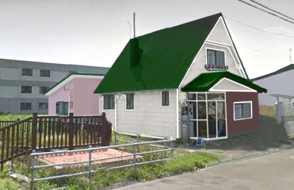 最終的に離れの壁はピンク色、ガレージは薄紫色に決めました。幌加内町の春に咲くカタクリさんとエゾエンゴサクさんの色です。