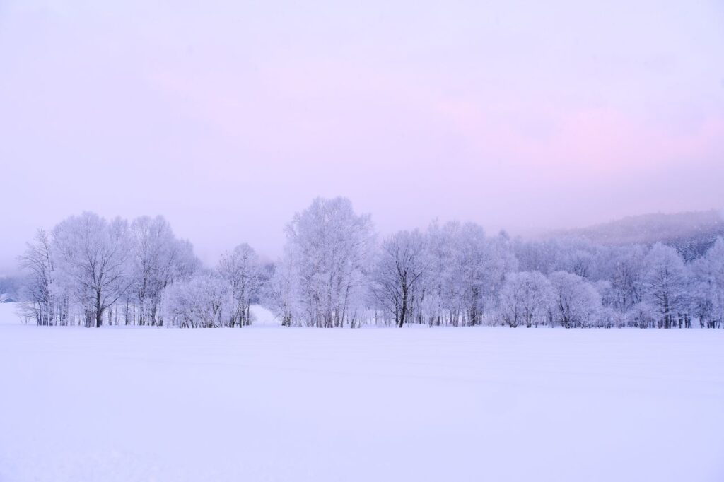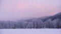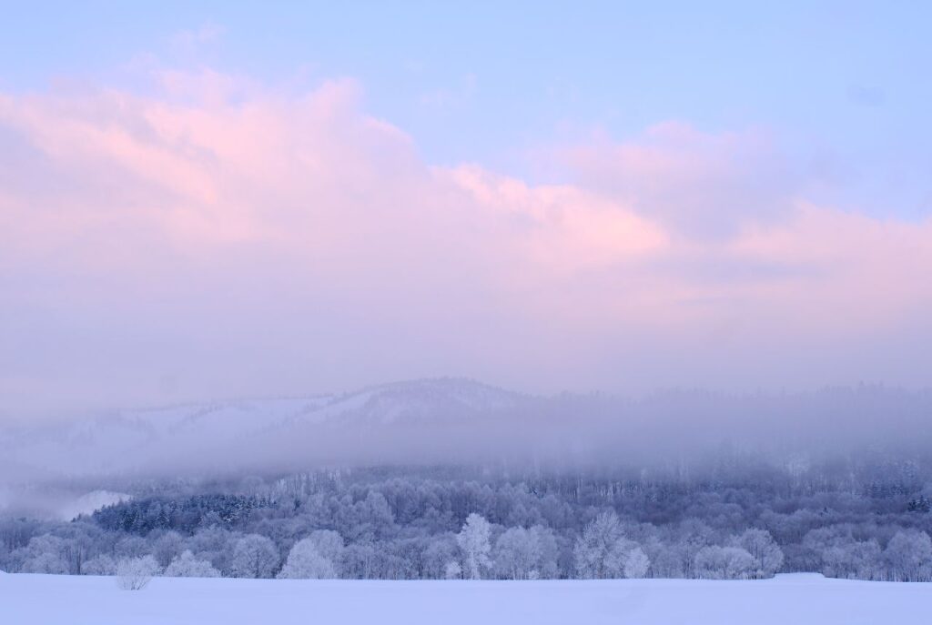 ほのかにピンク色の空と樹氷の森がすばらしい!