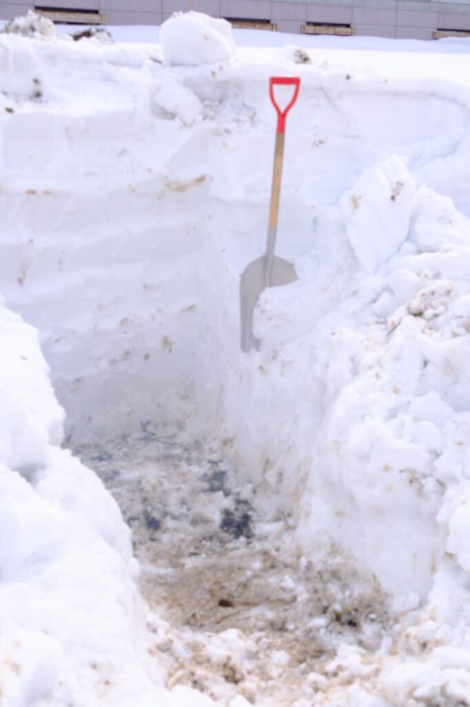 下部なるほど雪が固まって、アルミのスコップでも食い込まず、鉄製のスコップを使って、雪のブロックにした後持ち上げての排雪作業です!(^^)!