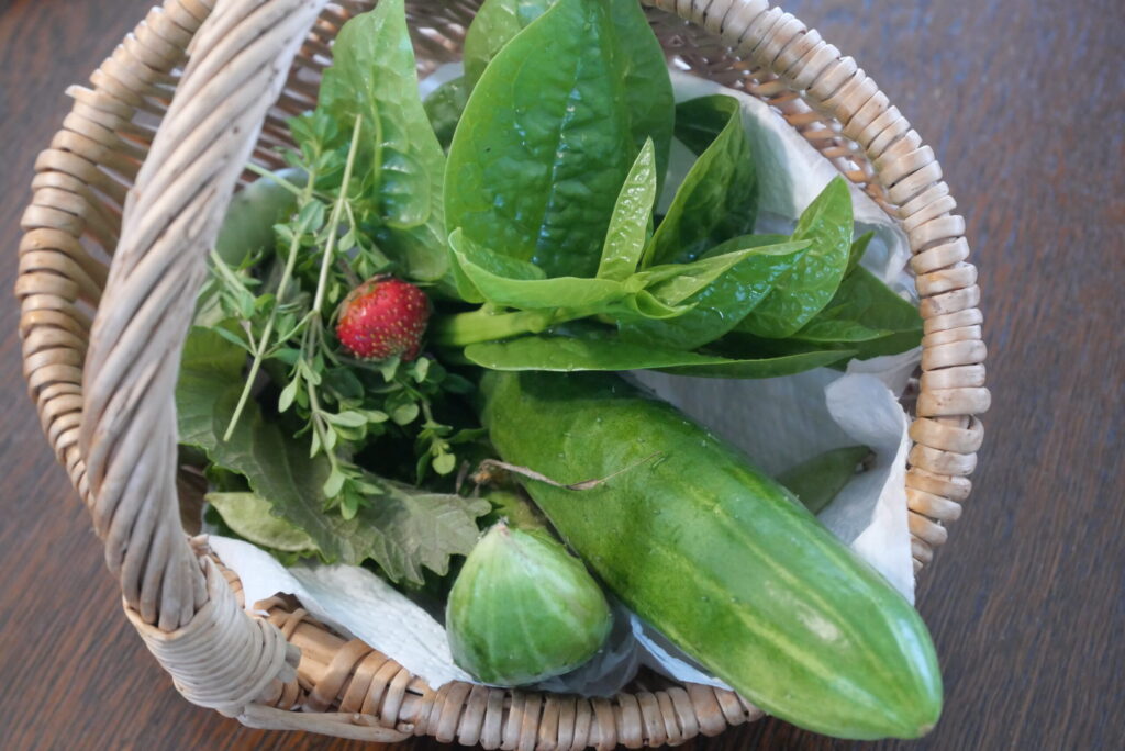 キュウリ、ツルムラサキ、イチゴや、シソ、タイムなどのハーブも採れ始めました。