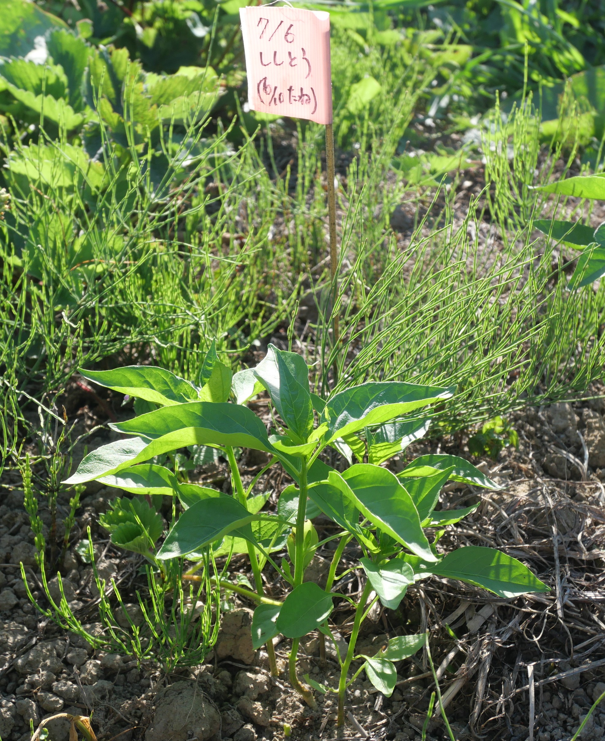 2025年8月2日 シシトウ 研究所日記 2025.09.08 (2025年春から夏にかけて撮影した畑の写真をさかのぼってアップしています。) 6月10日にポットに種を蒔き、7月6日に畑に植えたシシトウさん。 まだ小さく、花も咲いていません。 ちょっと種まきが遅すぎたですね。