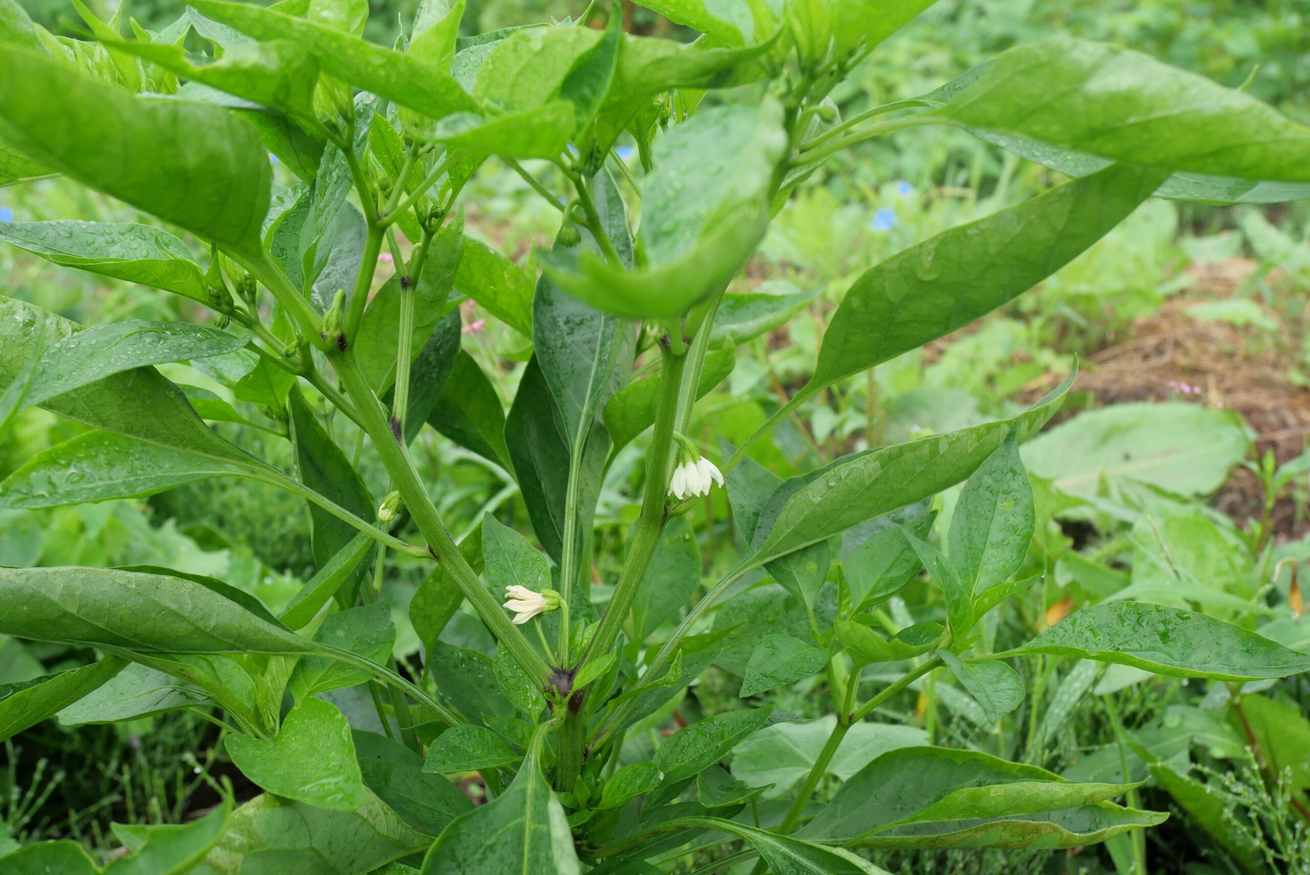 研究所日記自家採種の種から育てたピーマンさんは、花は咲きましたが、まだ実が生りません。