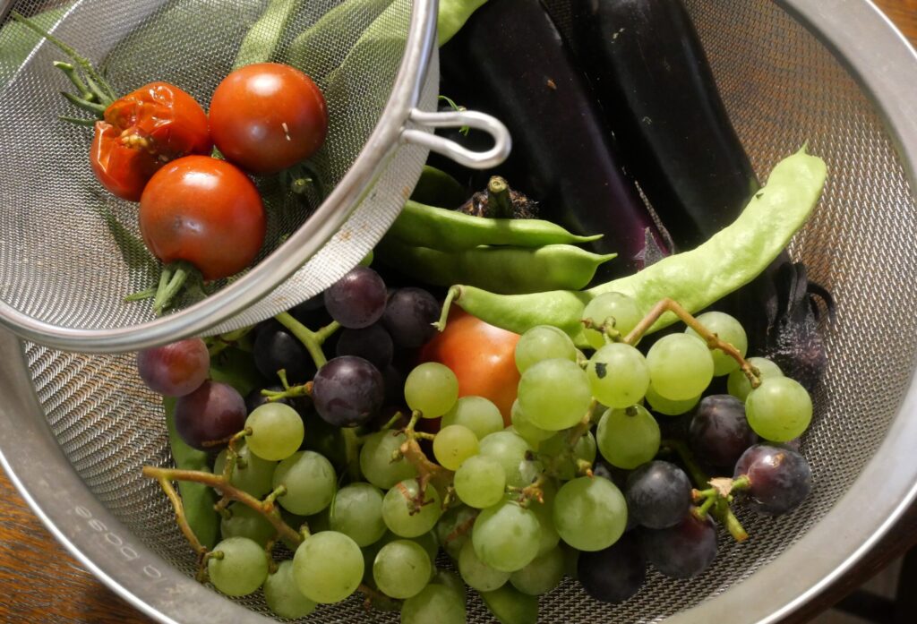 ブドウやナス、ミニトマト、枝豆、ミョウガ、モロッコいんげん、キュウリなども採れています。
