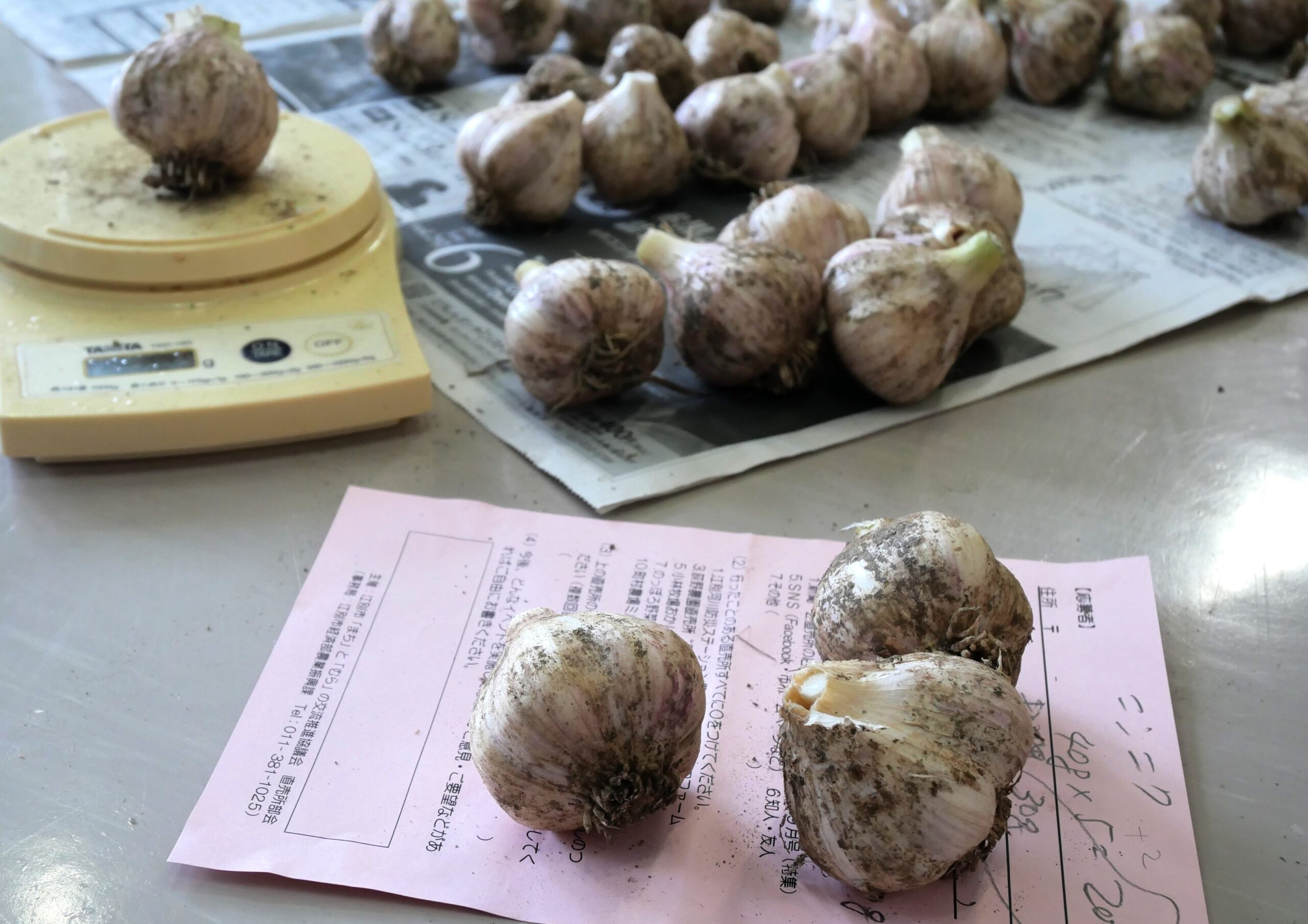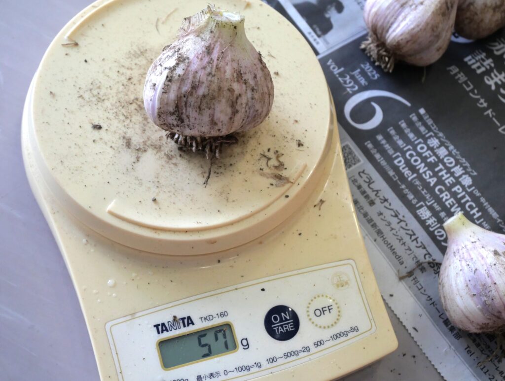 2025年8月4日 ニンニク収穫 研究所日記 2025.10.27 (2025年春から夏にかけて撮影した畑の写真をさかのぼってアップしています。) 全部で3㎏以上採れました! 50gを越える大きなものも! ニンニク栽培3年目、順調に過去最高記録を更新中です!