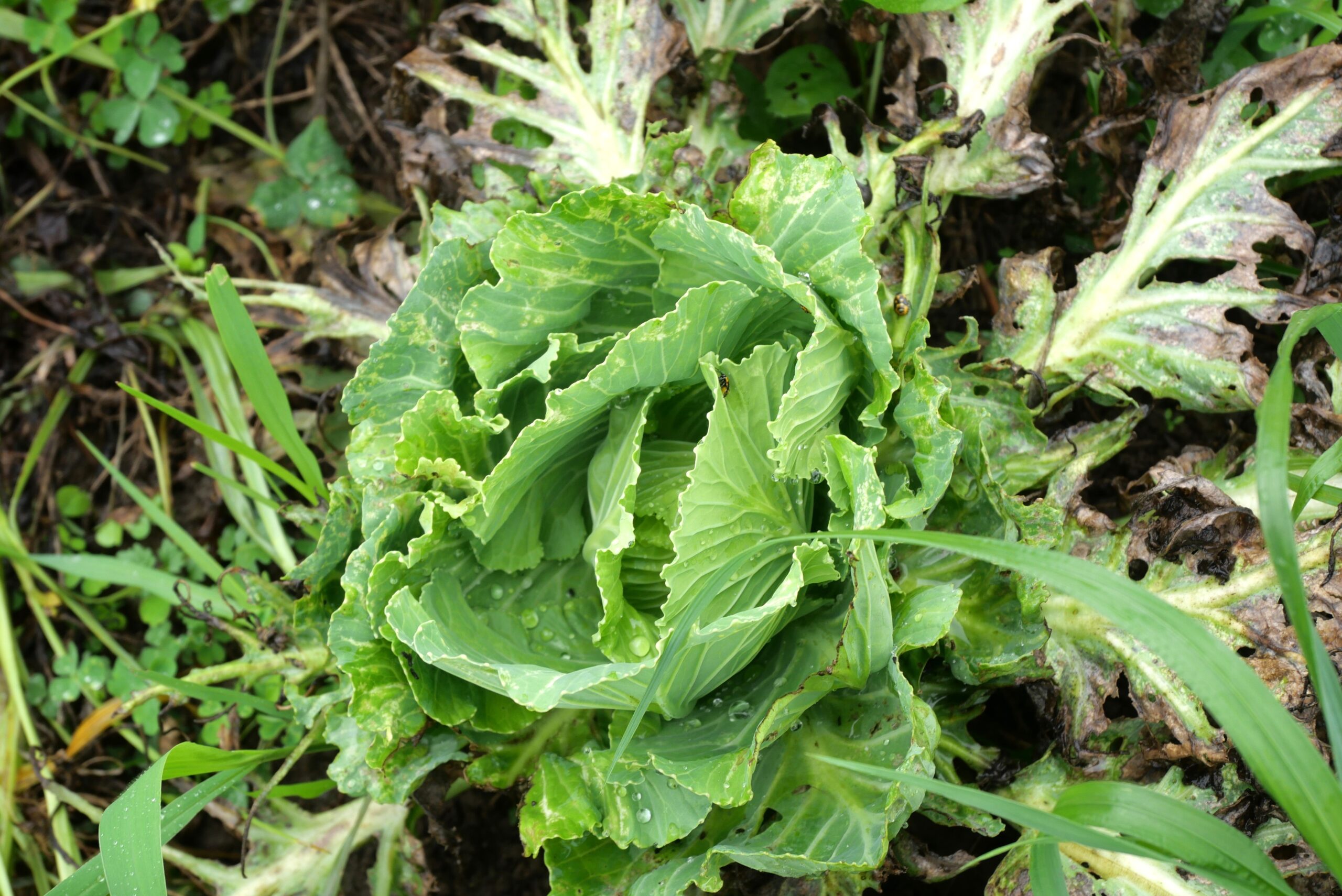 4月にポットに種を蒔いて苗を作り、5月に畑に植え、その後すくすく育っていたキャベツさん。