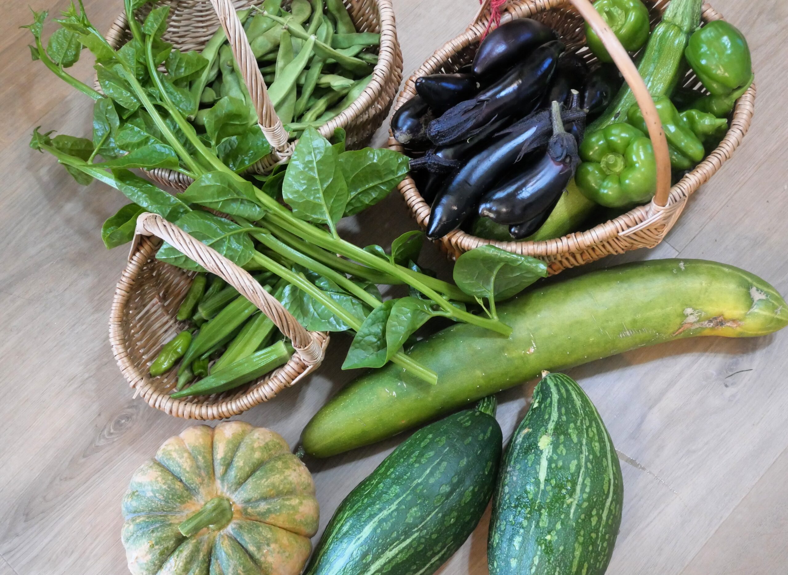 モロッコいんげん、つるむらさき、オクラ、シシトウ、菊座かぼちゃ、ロロンカボチャ、ナス、ピーマンなどなど、たっくさん採れました!