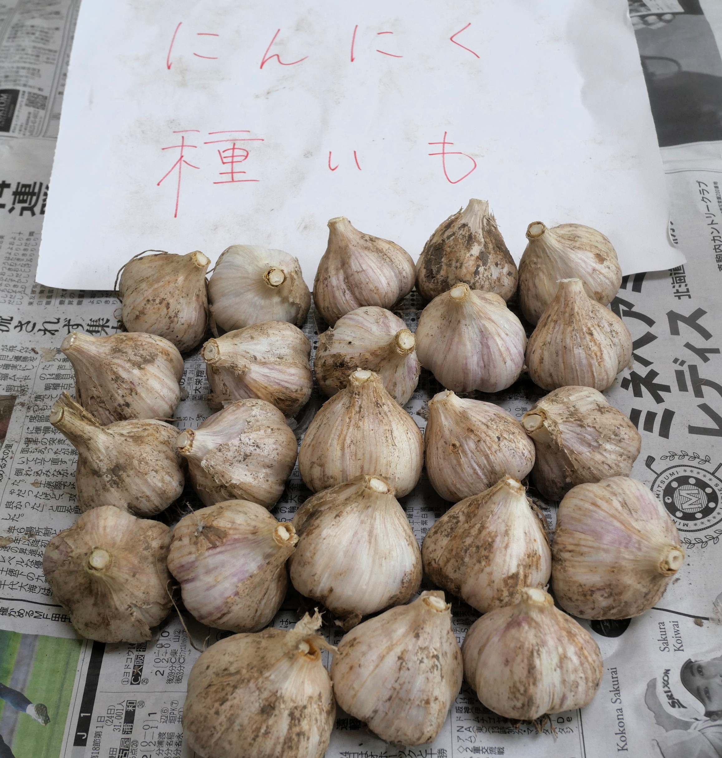 今年収穫したニンニクの中から、植え付け用に取り分けて置いた23個のニンニクさん。