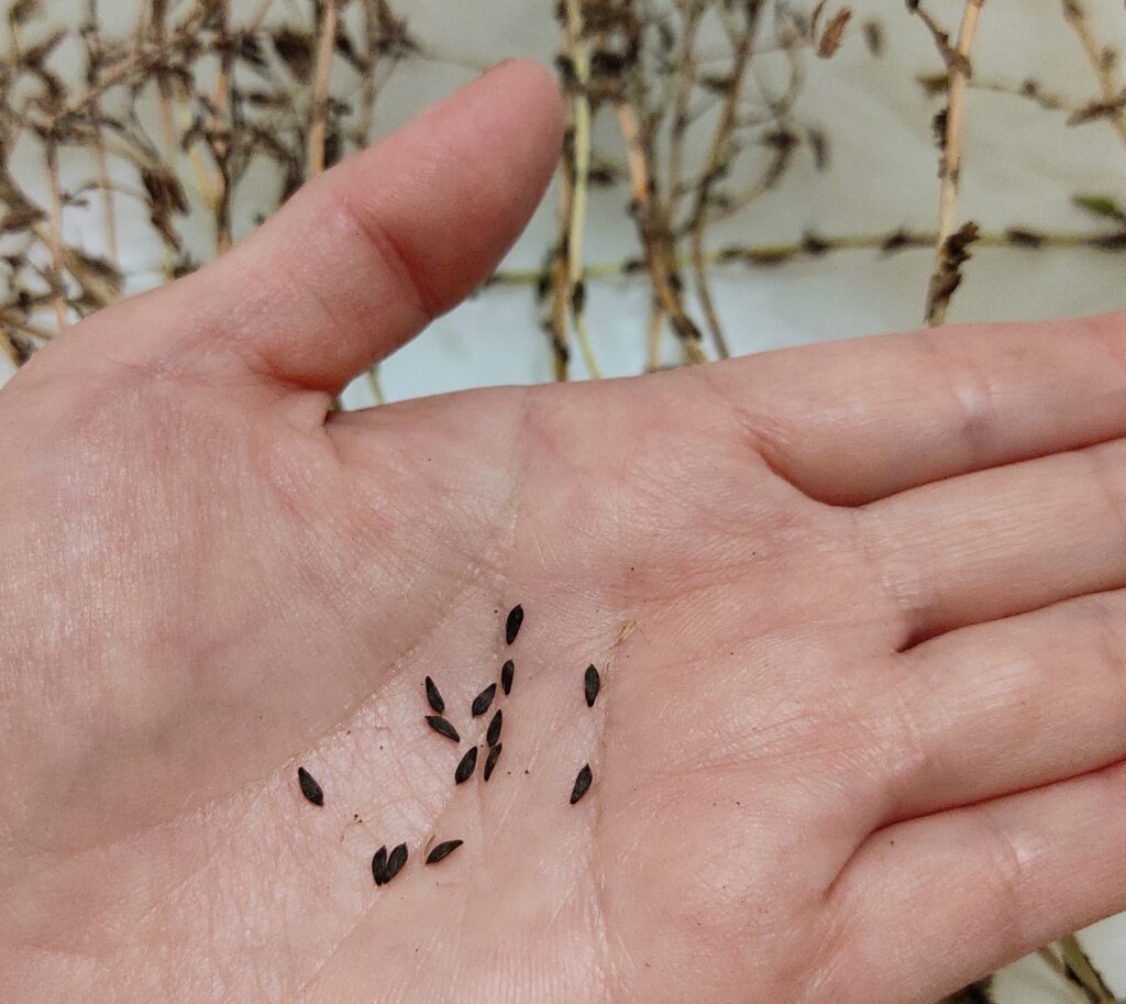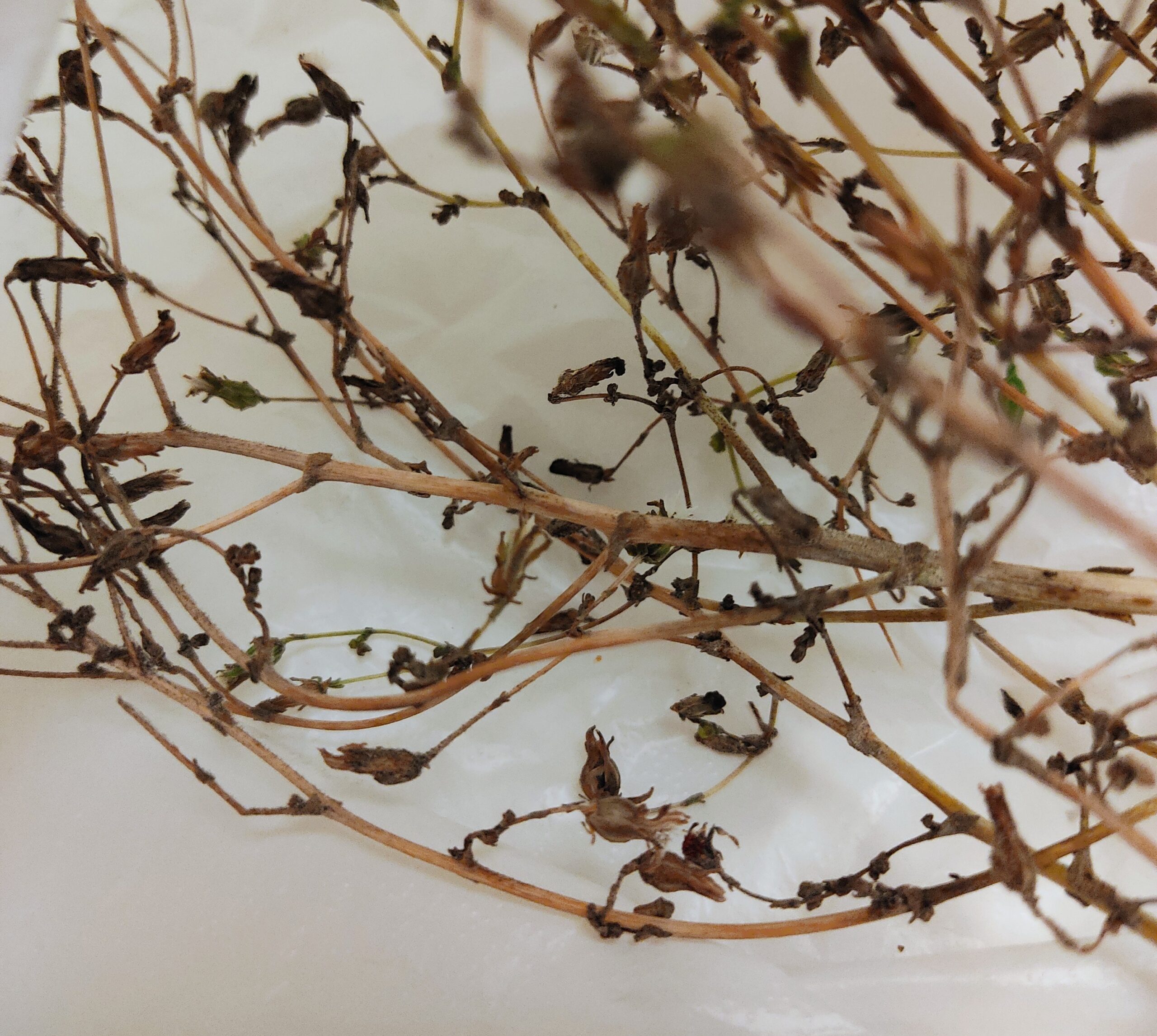 花が枯れた後の丸く膨らんだところをもみほぐしてみたら、ありました!